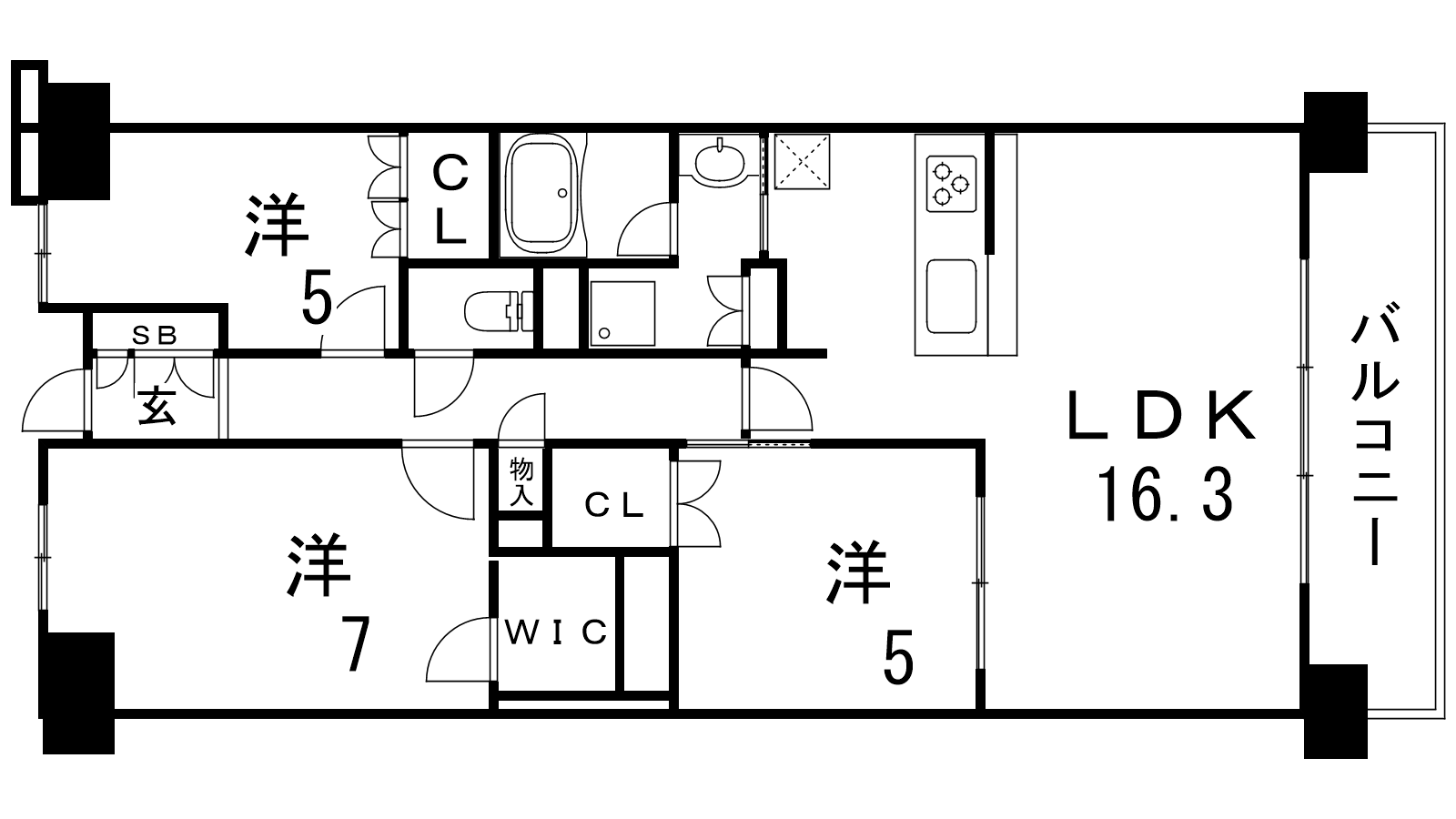- LDK16.3帖、洋室7帖、洋室5帖、洋室5帖