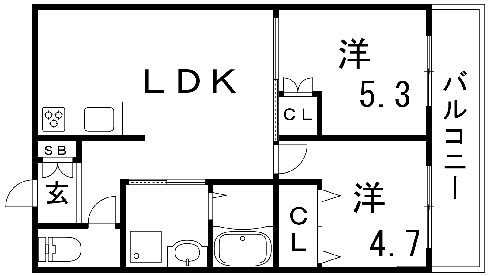 - LDK10帖、洋室5.3帖、洋室4.7帖