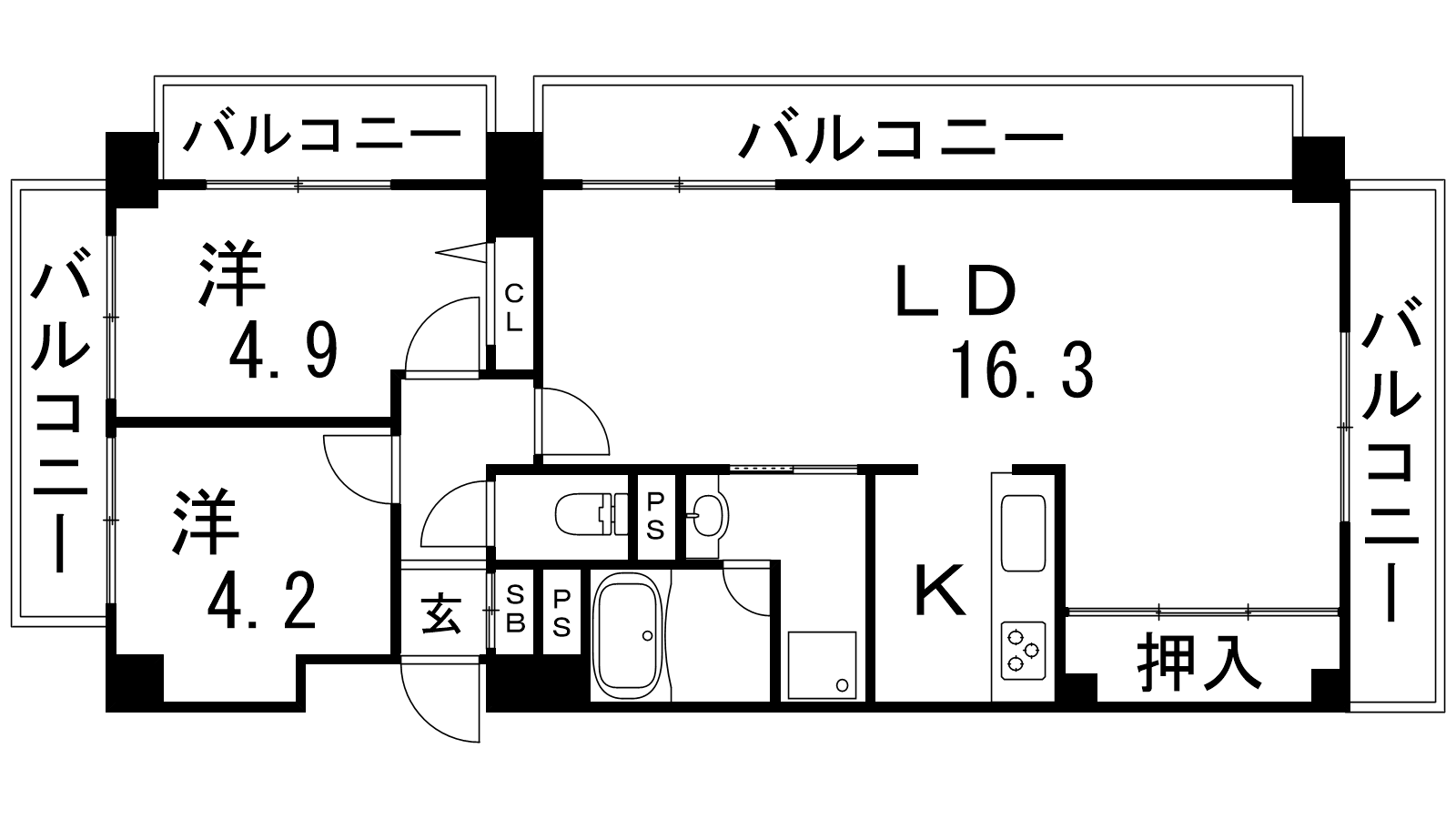 - LDK16.3帖、洋室4.9帖、洋室4.2帖