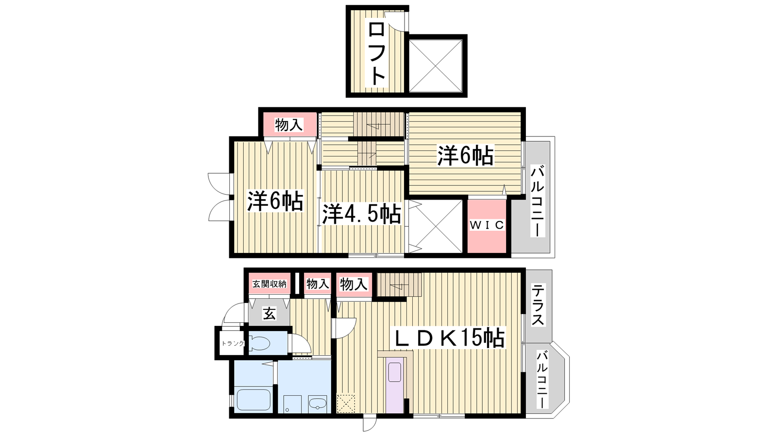 - LDK15帖、洋室6帖、洋室6帖、洋室4.5帖
