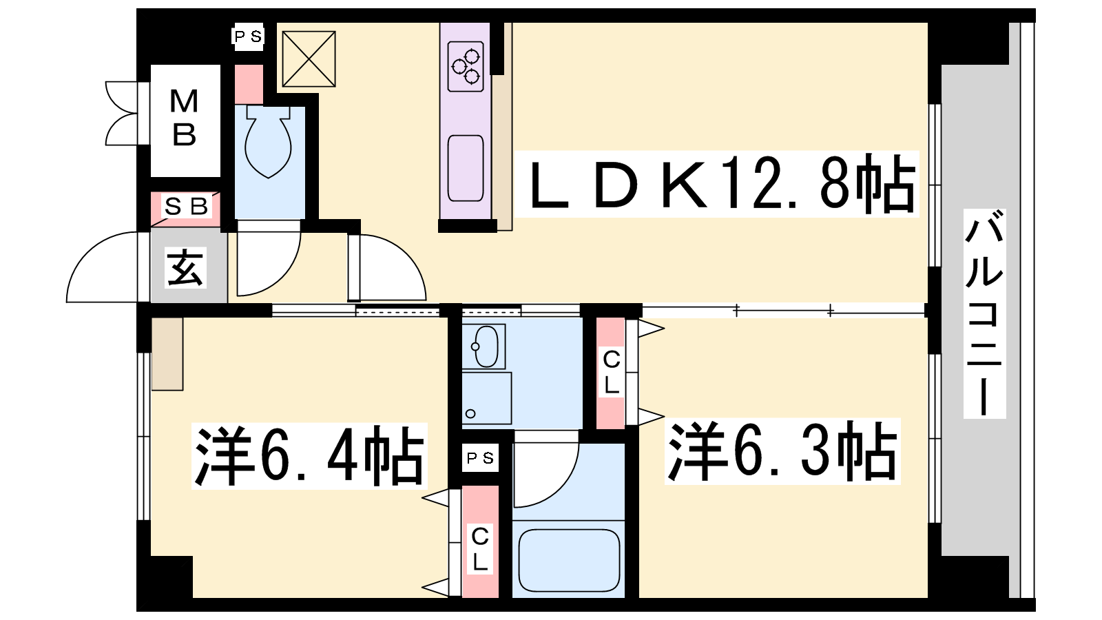 - LDK12.8帖、洋室6.3帖、洋室6.4帖