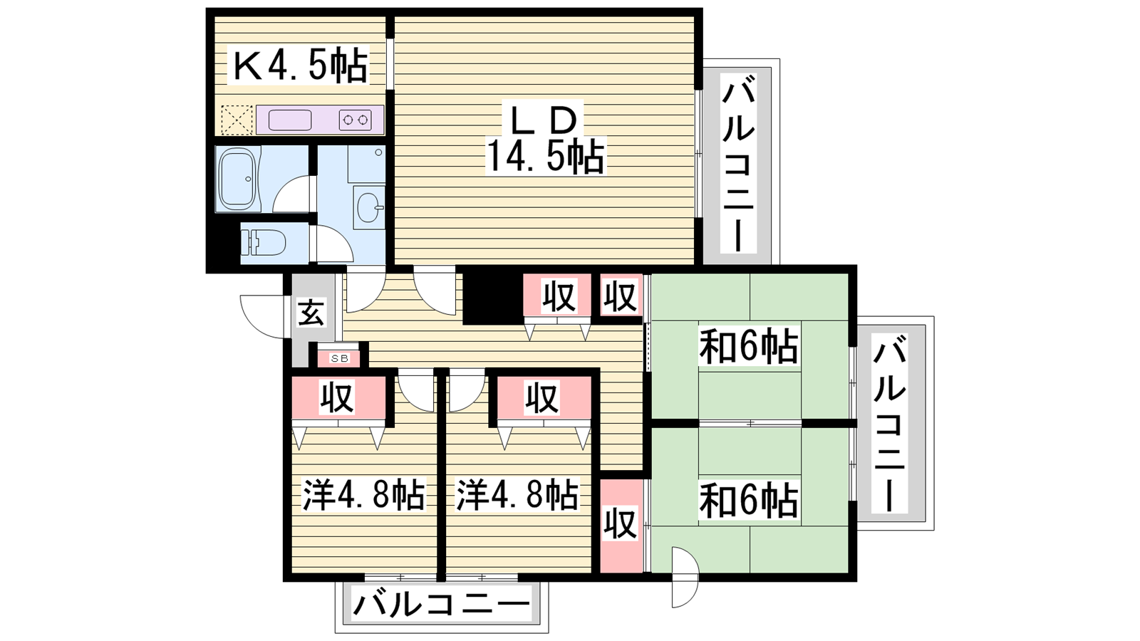 - LDK18.5帖、洋室4.8帖、洋室4.8帖、和室6帖、和室6帖