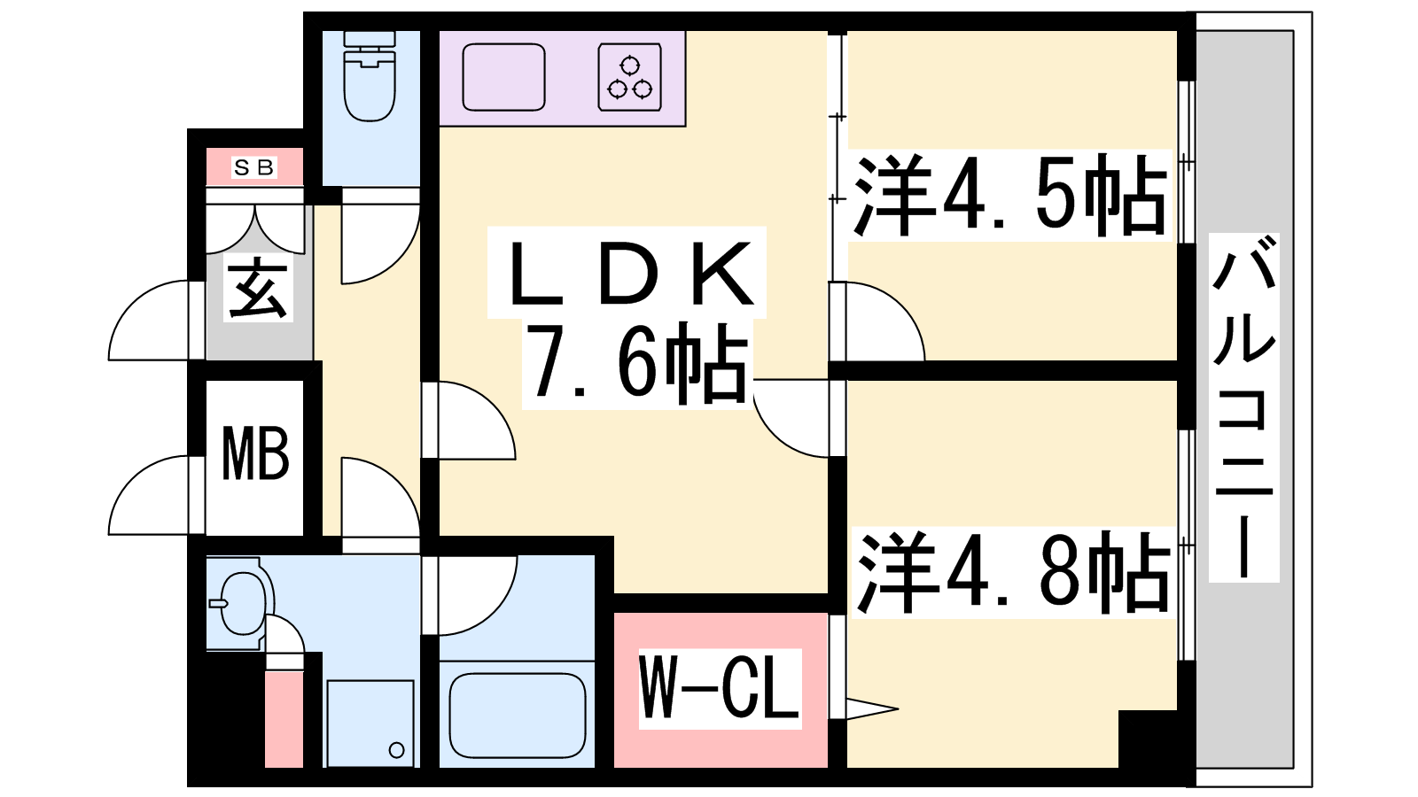 - LDK7.6帖、洋室4.8帖、洋室4.5帖