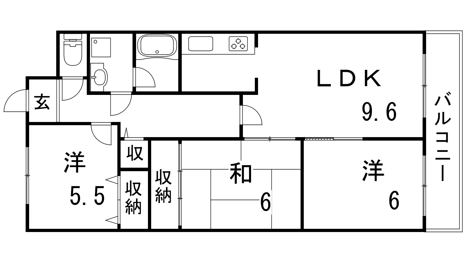 - LDK9.6帖、洋室6帖、洋室5.5帖、和室6帖