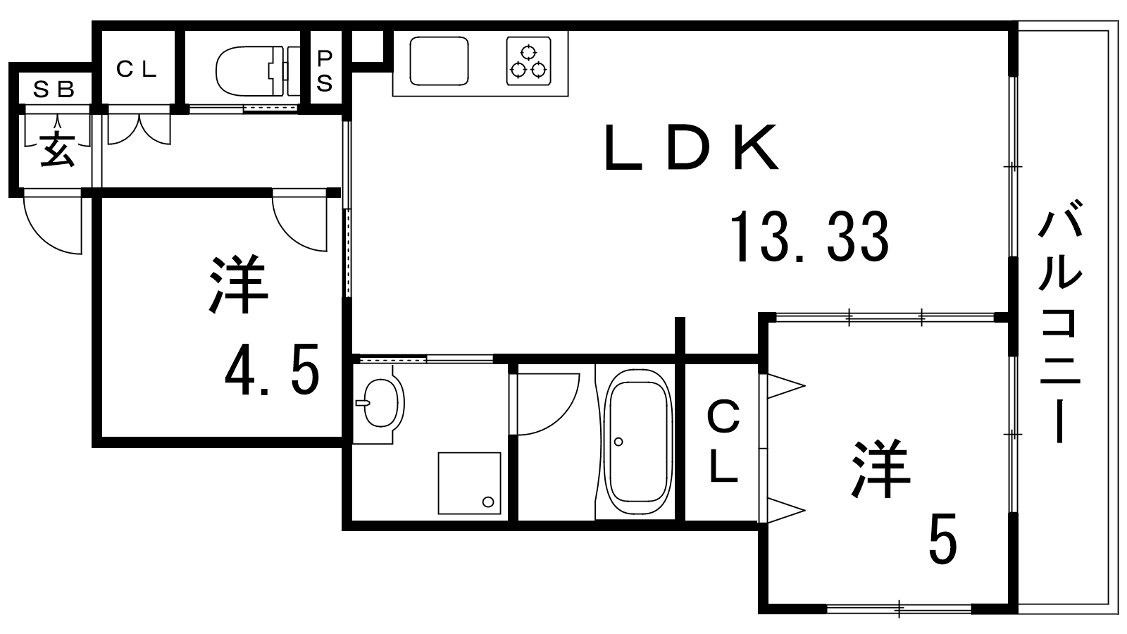 - LDK13.33帖、洋室4.5帖、洋室5帖