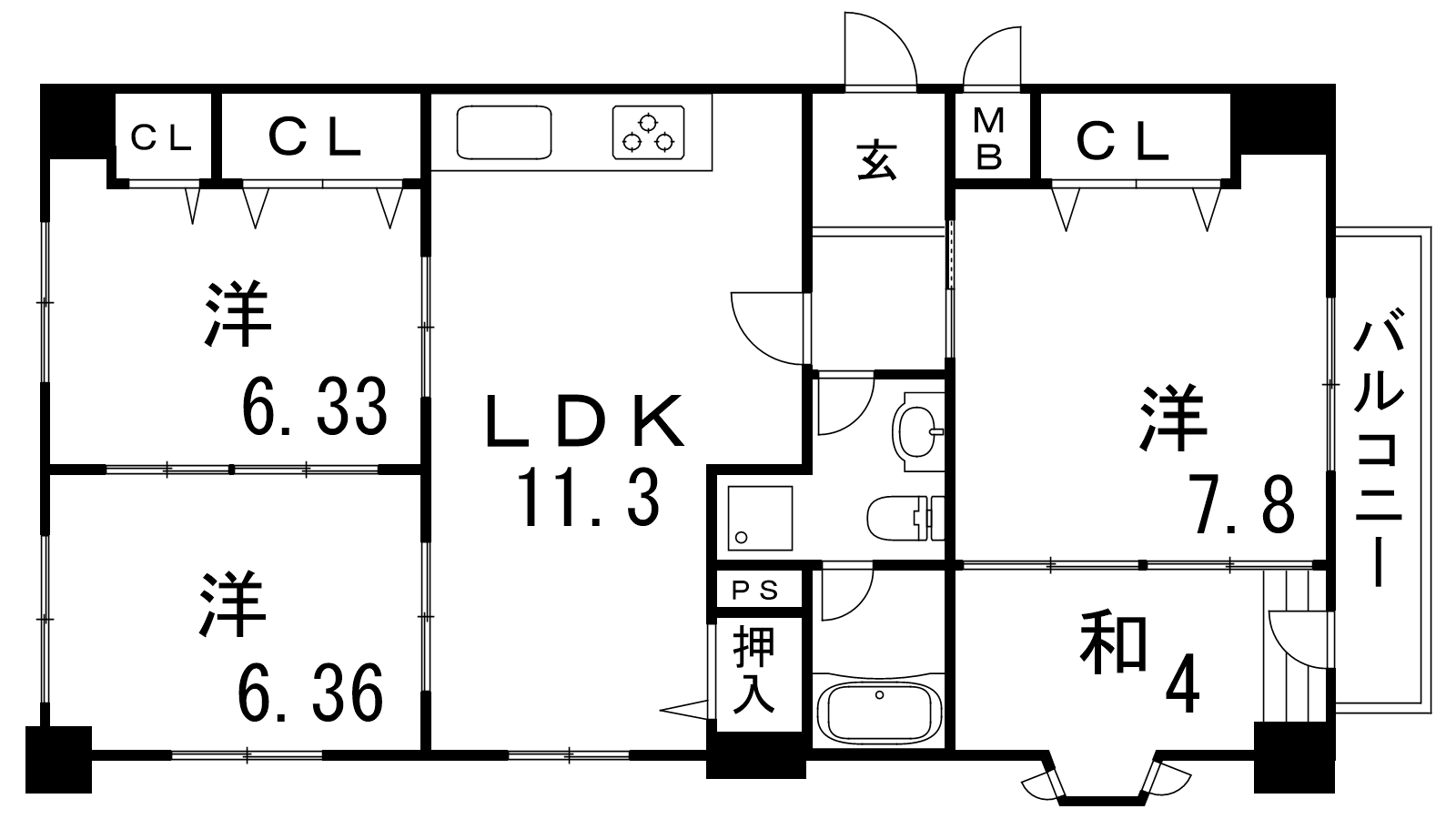 - LDK11.3帖、洋室7.8帖、洋室6.36帖、洋室6.33帖、和室4帖