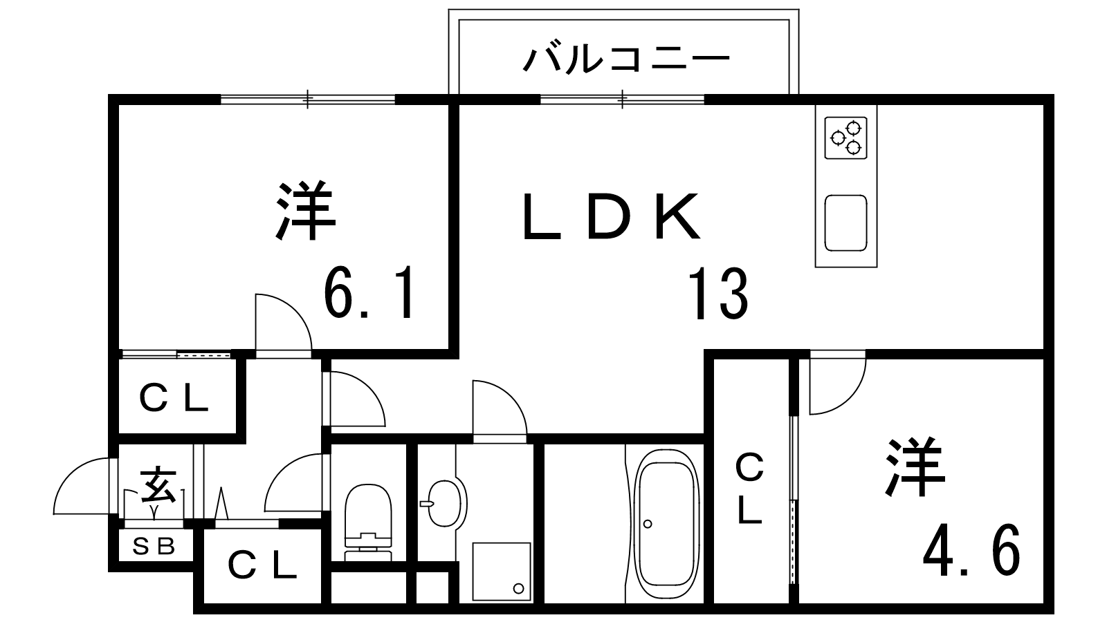 - LDK13帖、洋室6.1帖、洋室4.6帖