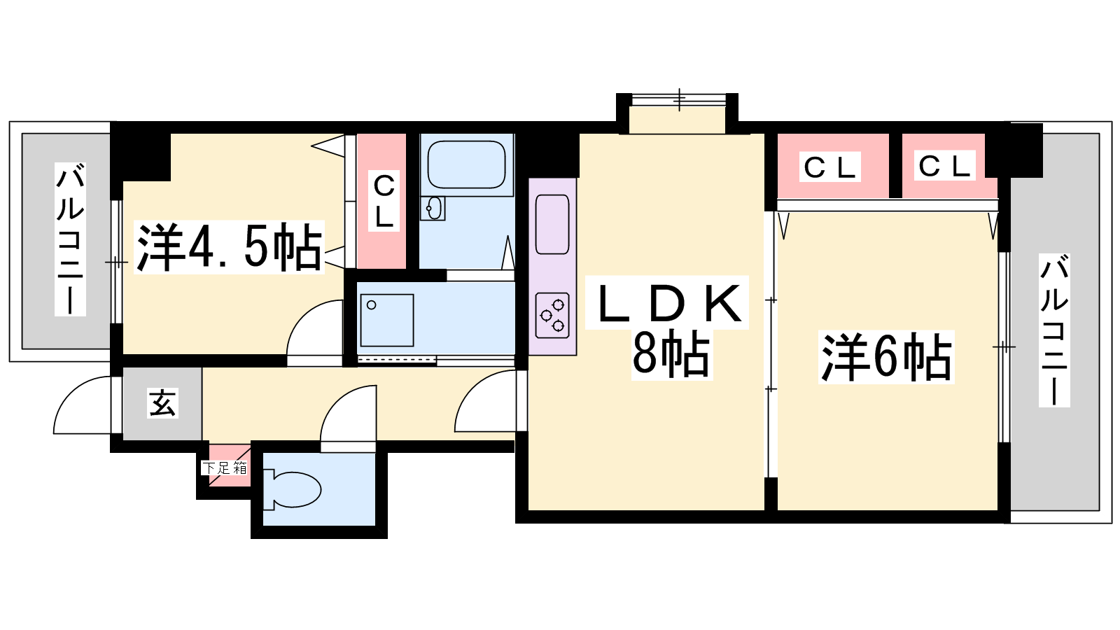 - LDK8帖、洋室6帖、洋室4.5帖