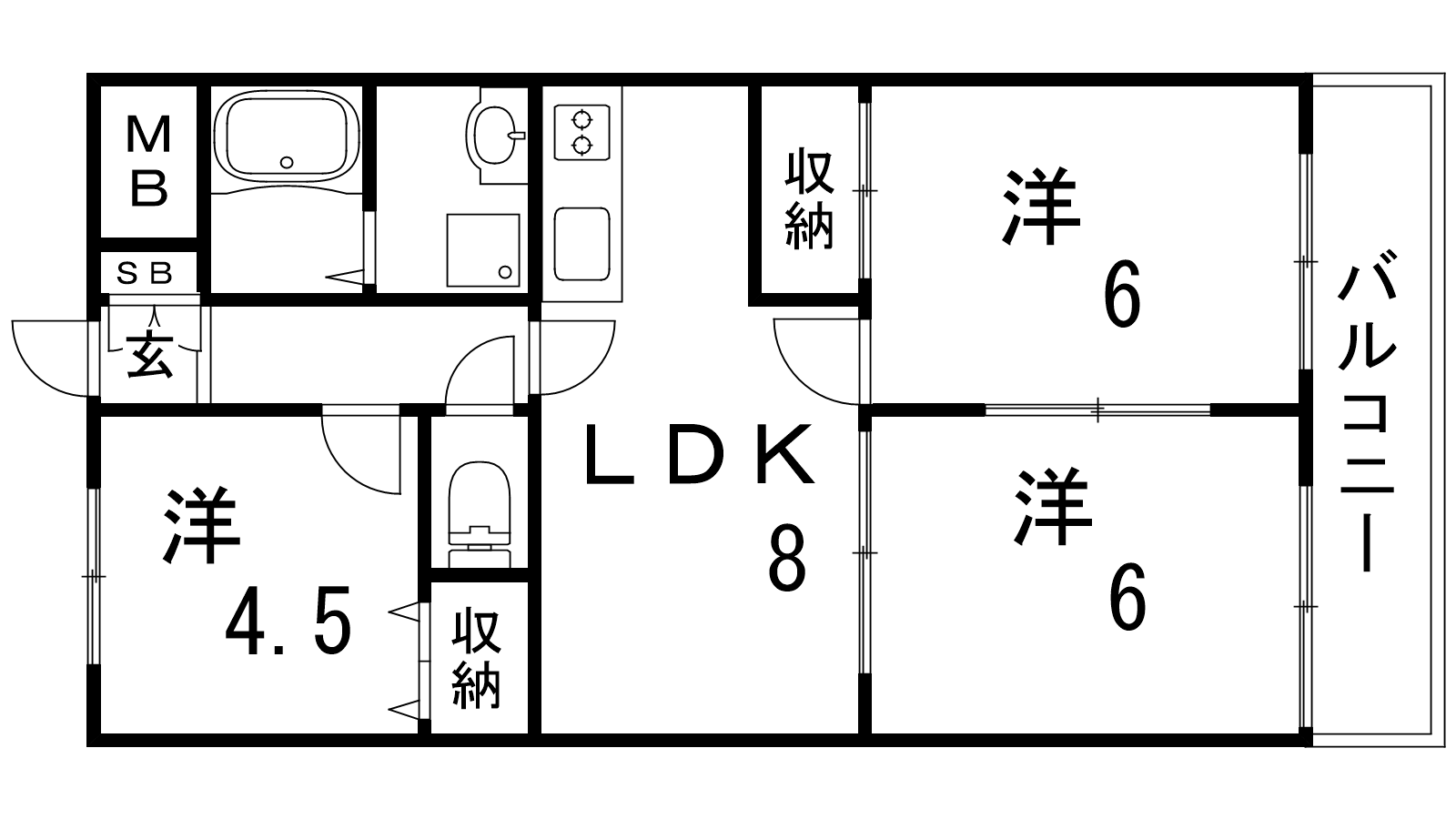 - LDK8帖、和室6帖、洋室6帖、洋室4.5帖