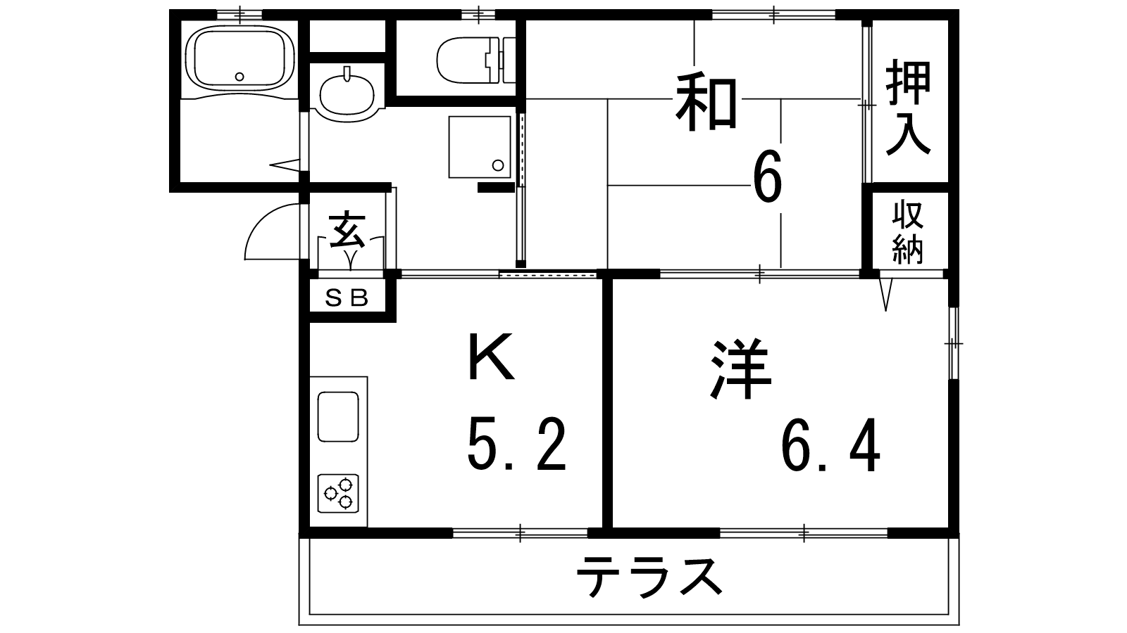 - K5.2帖、和室6帖、洋室6.4帖
