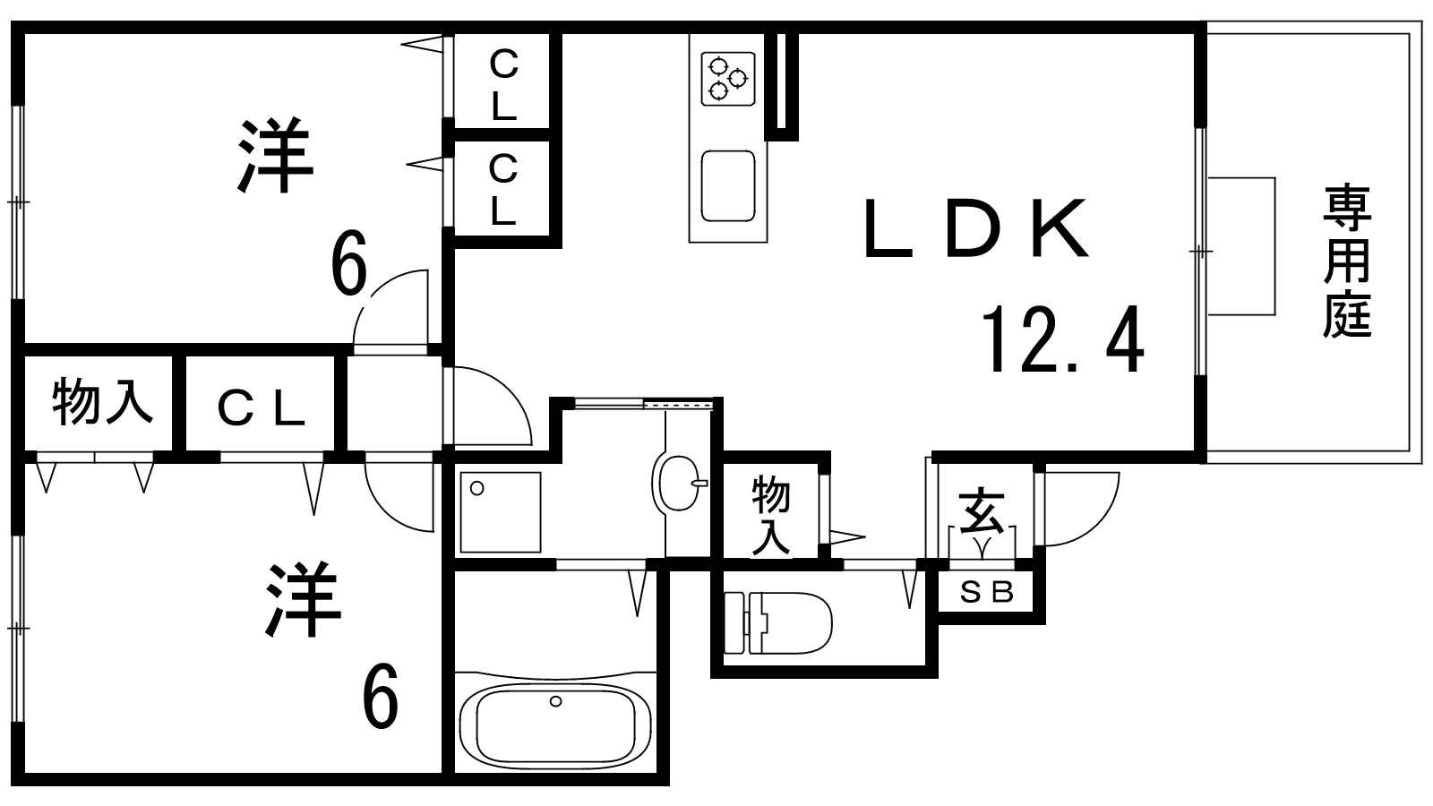 - LDK12.4帖、洋室6帖、洋室6帖