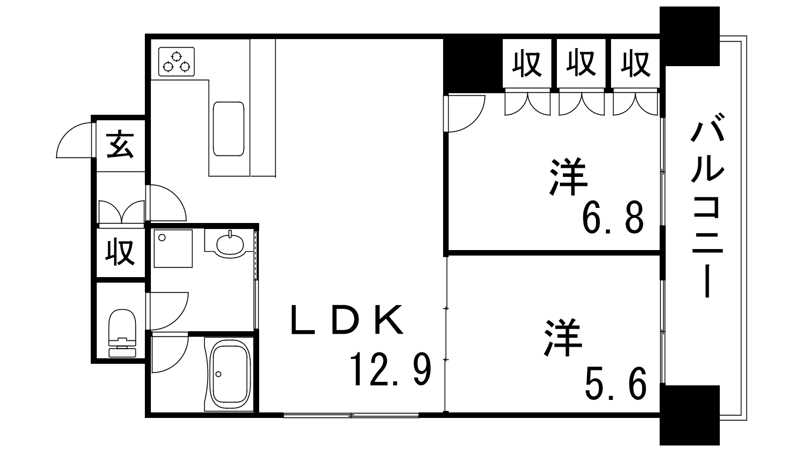 - LDK12.9帖、洋室6.8帖、洋室5.6帖