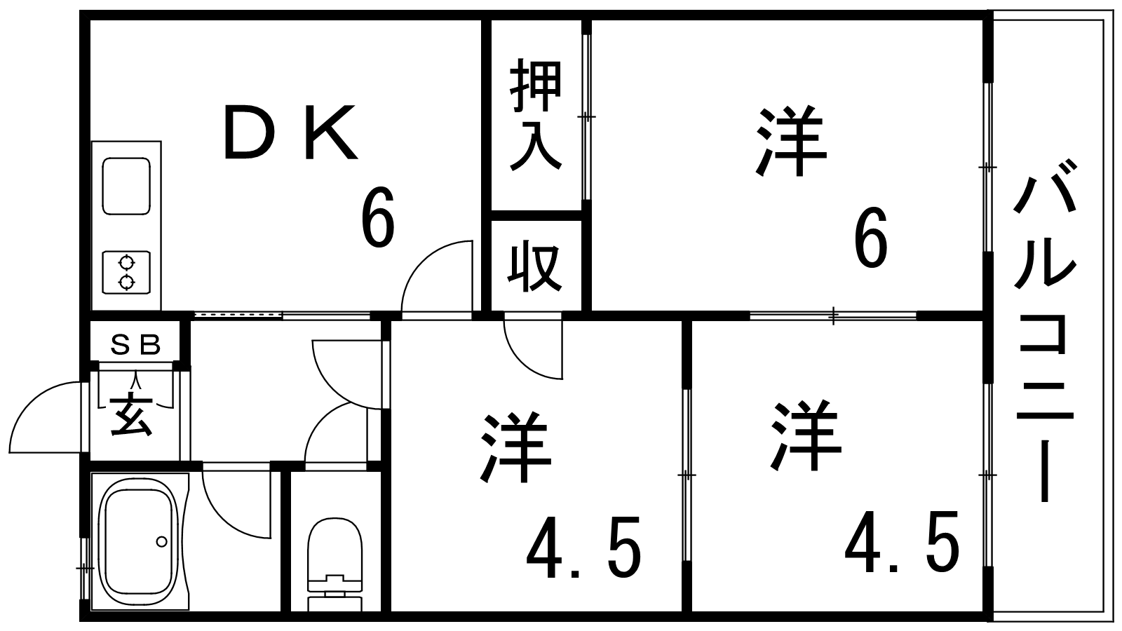 - DK6帖、洋室4.5帖、洋室4.5帖、洋室6帖