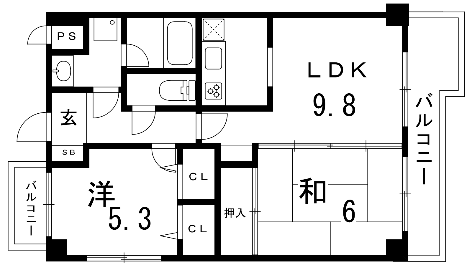 - LDK9.8帖、洋室5.3帖、和室6帖
