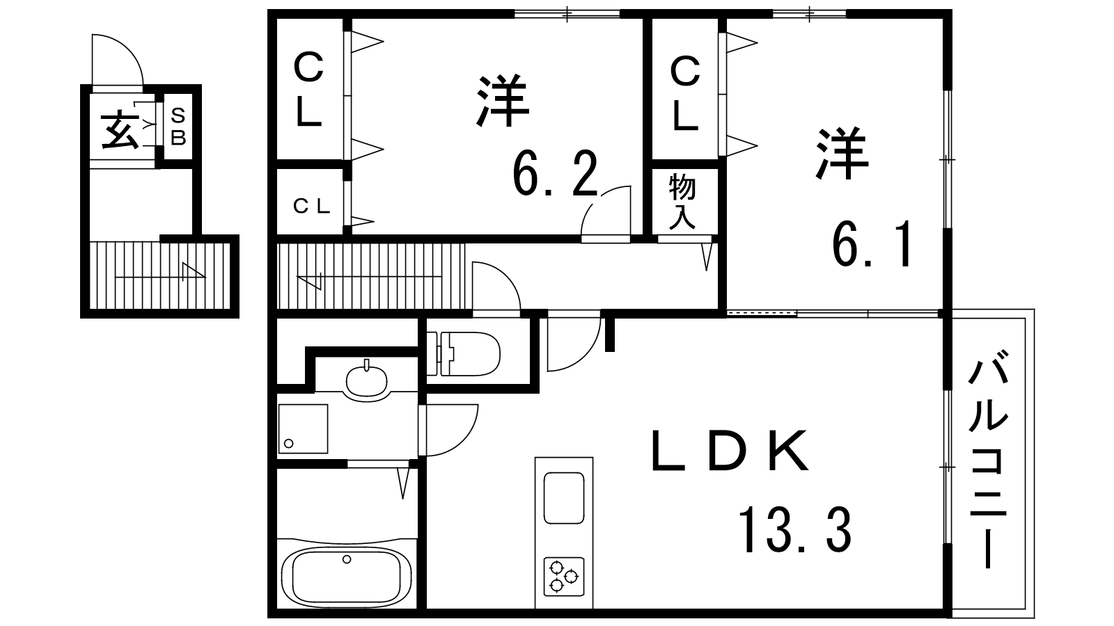 - LDK13.3帖、洋室6.1帖、洋室6.2帖