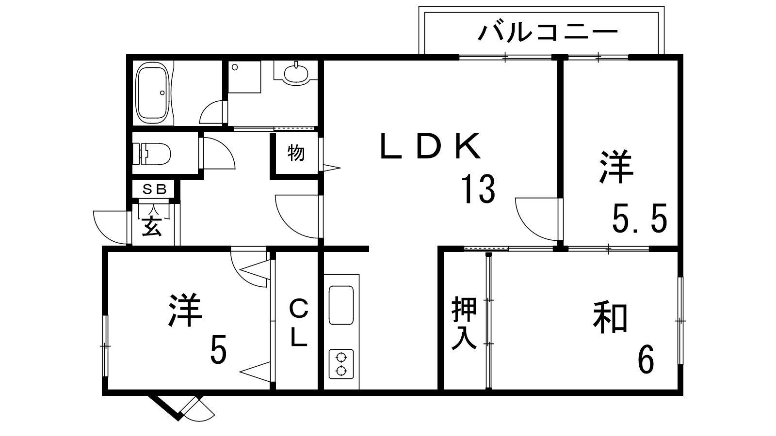 - LDK13帖、洋室5.5帖、洋室5帖、和室6帖