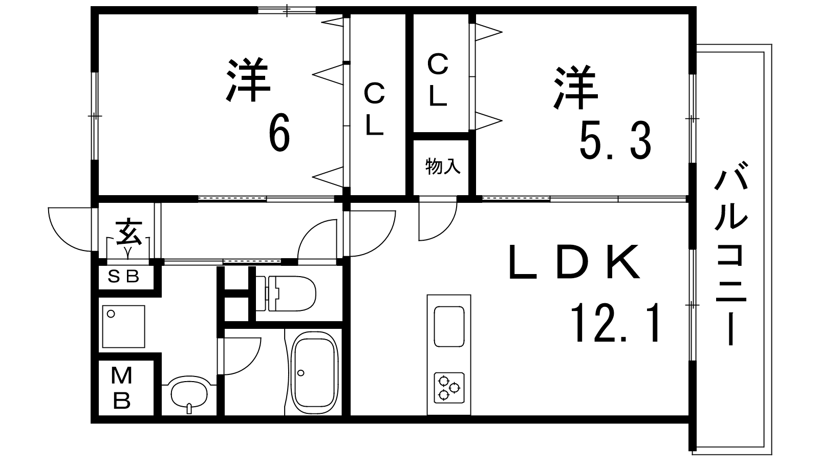 - LDK12.1帖、洋室6帖、洋室5.3帖
